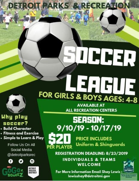 Registration for the City of Detroit’s girls and boys ages 4-8 soccer league is going on now!